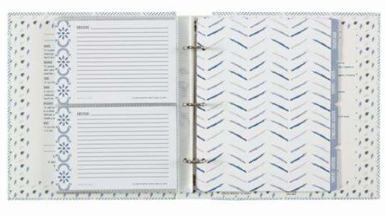 3-ring construction. 12 tabbed dividers. 40-4"x6" recipe cards, 20 PVC-free pocket pages. Refillable (QP12) 9" x 9.375" x 1.75"