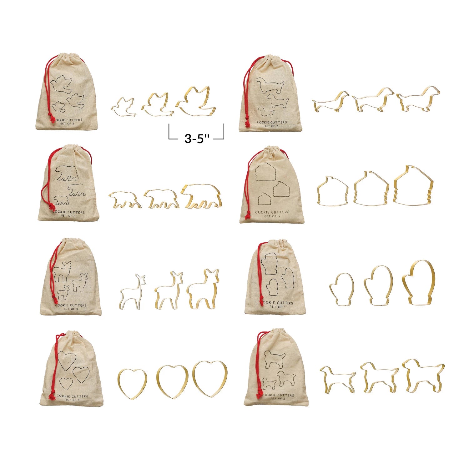 Stainless Steel Cookie Cutters in Printed Drawstring Bag, Gold Finish, Set of 3, 8 Styles