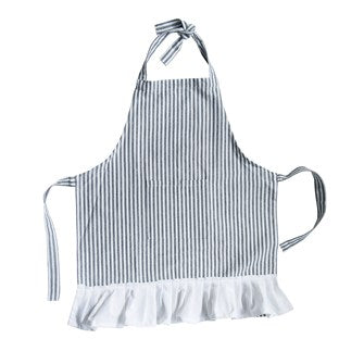 One size fits most kids apron Color: Black and Cream stripe 100% cotton Dimensions: 24"L x 20"W Made in India Machine wash