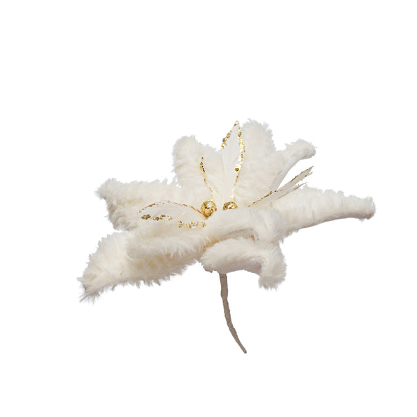 7" Round Faux Fur Poinsettia Clip-on Ornament w/ Glitter, White & Gold Finish