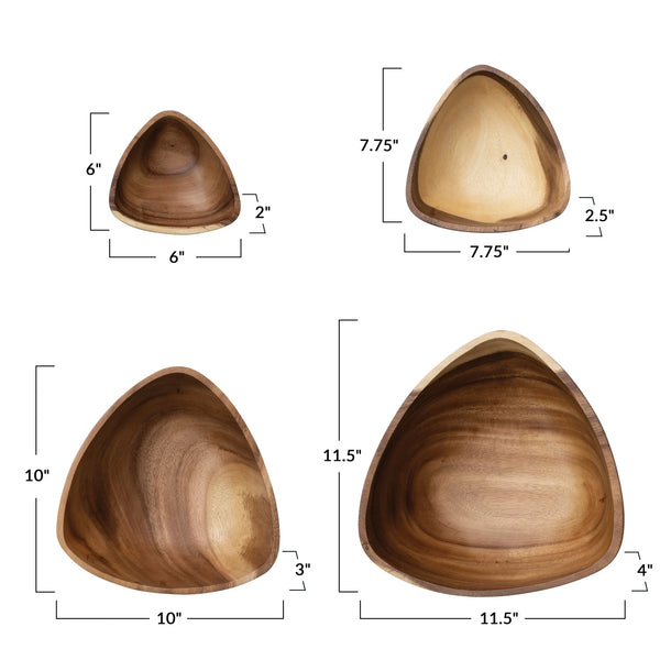 XL-11-1/2"L x 11-1/2"W x 4"H L-10"L x 10"W x 3"H M-7-3/4"L x 7-3/4"W x 2-1/2"H S- 6"L x 6"W x 2"H Acacia Wood Bowls, Natural