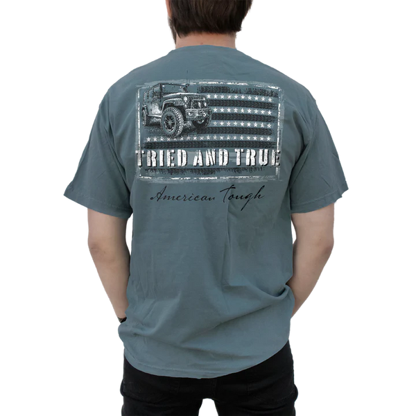 Tried and True Brand Another American flag rendition. This time with a tricked out 4x4 with a snorkel and mud tired, ready to hit the back country. Printed on an...