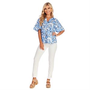 Cotton cambric top with V-neck features oversized short sleeves and boxy fit. Measures approximately 26" from shoulder to hem on size small.