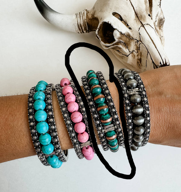 Stone Stretch Bracelet | Western Turquoise pink silver patina turquoise Stackable Bracelet Natural Stone Bracelet Bangle Stone stretch bracelet - 2.375" Diameter -.60 width - Stretch band - Lead compliant...