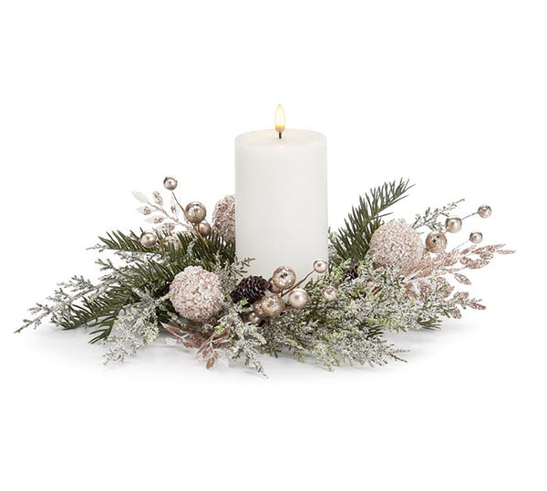 Plastic candle ring with foam winter greenery and pine with gold leaves, balls and round ornaments with beading all over.6"H x 6"W x 1.5"D. 4.5" Diameter.