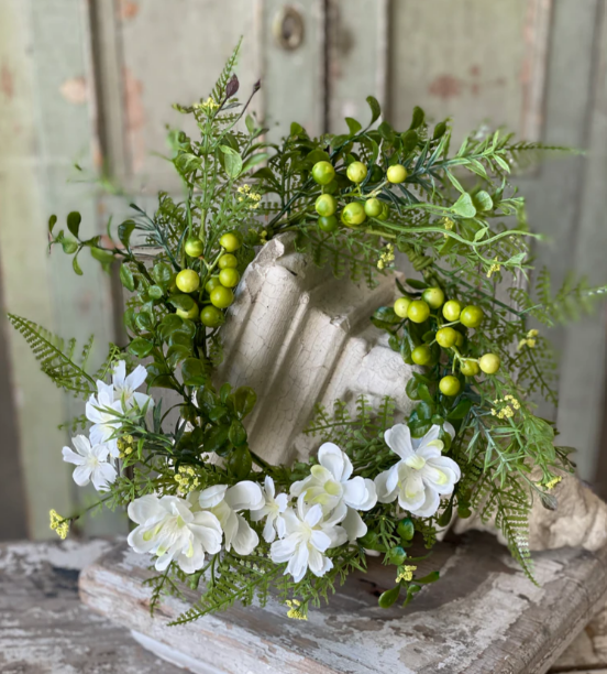 Chantilly Fields Candle Ring | 14" A collection framed with a bounty of mixed greenery, branching accents and ferns that showcase creamy spring blossoms, sprigs of tiny bubble berries and...