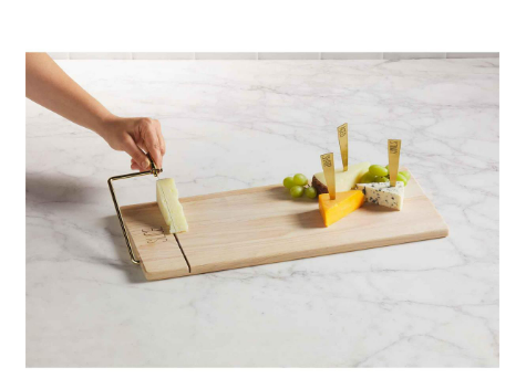 4-piece set. Engraved wood cheese serving board features metal cheese slicing arm for precision slices. Comes with three brass plate markers.
