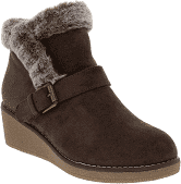 Synthetic upper with faux fur details Ankle-high shaft Pull-on style with buckle closure Lightly cushioned footbed Textured outsole 2" wedge heel Available in whole sizes only, half sizes please order...