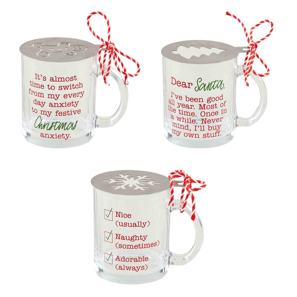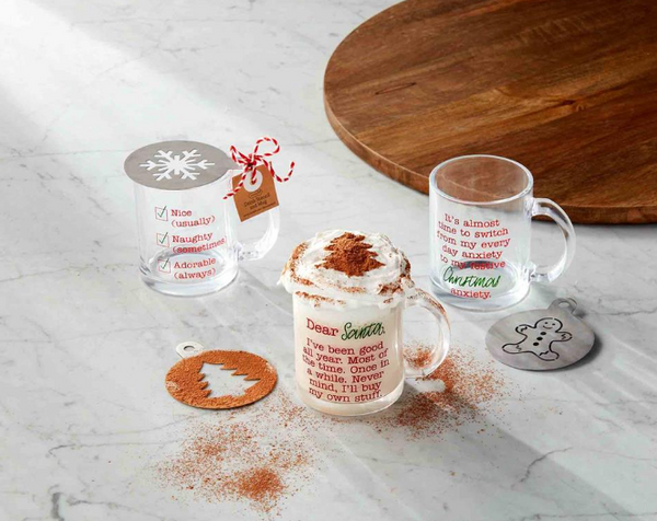 2-piece set. Glass mug comes with stainless steel coffee stencil.  Mug 12 1/2 oz Stencil 4 3/4" x 3 3/4" Glass