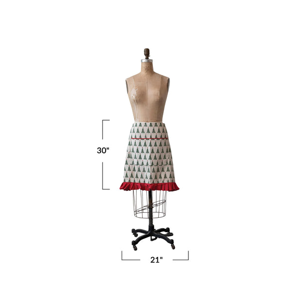 Cotton Printed Half Apron w/ Christmas Tree Pattern, Pocket & Ruffle