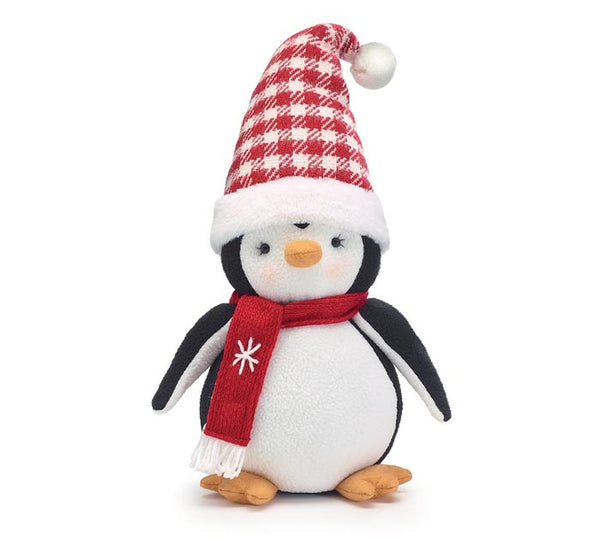 Black and white penguin plush decor. Penguin wearing a red and white pointed hat with red scarf.Made of fabric and sand.18"H X 9"W X 6"D