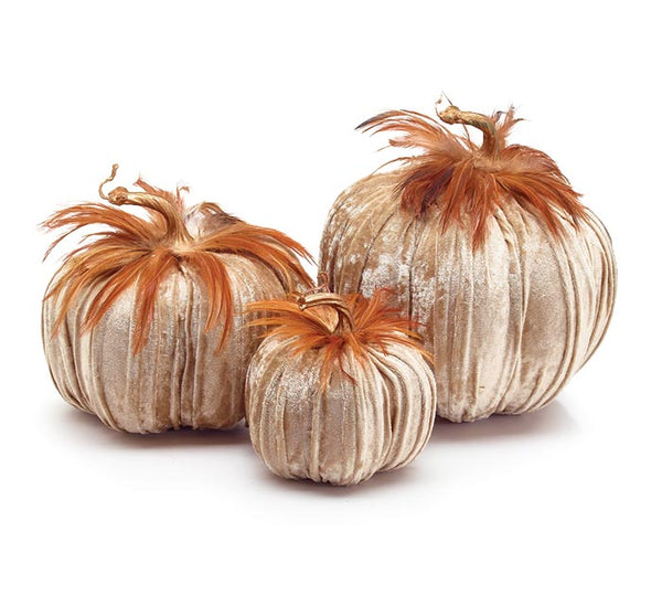 Decor pumpkins wrapped in champagne colored velvet with feathers on top. Each pumpkin is weighted.Made of foam and plastic.Large:8 1/2" H x 8" Dia x 1.35 lbs.Medium: 6 1/4" H...
