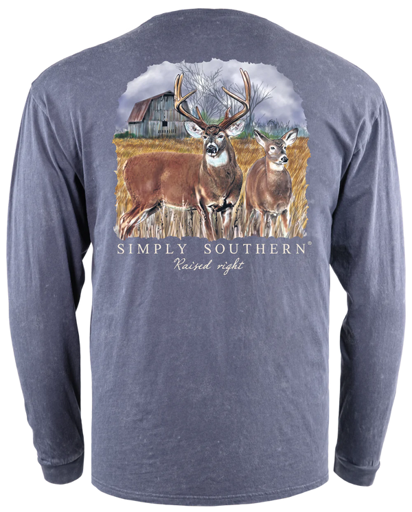Indigo blue long sleeve Simply Color shirt with two dears in a field with a barn in the background; the phrase "Raised right"; and the Simply Southern Logo on the...