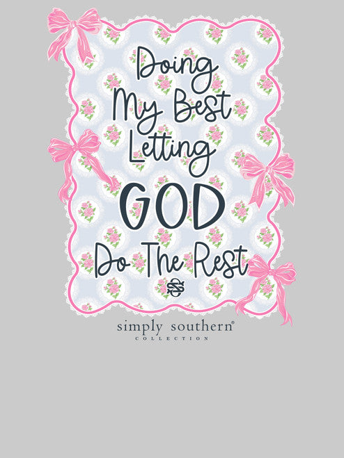 Sport grey long sleeve shirt with the phrase 'Doing my best, Letting God do the rest' adorned with pink bows on a floral background. Simply Southern logo below. Pink bow...