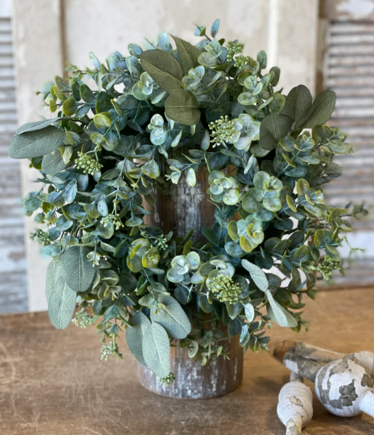 Driftaway Eucalyptus Wreath | 16" A gorgeous cascading eucalyptus with lightly powdered leaves and clusters of seed heads drifting throughout the greenery. 16" | 6" inner materials: plastic, polyester, molded...