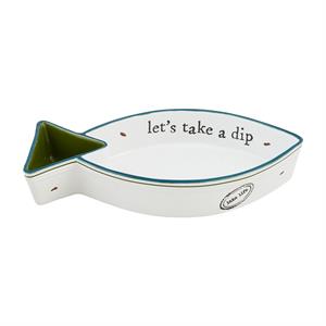 Hand-painted stoneware fish shaped chip server with attached tail dip well.