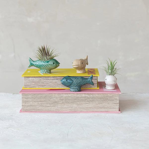4-1/2"L x 1-1/2"W x 2"H Stoneware Footed Fish Shaped Container/Toothpick Holder, Reactive Glaze, 4 Colors (Each One Will Vary) SOLD SEPERATELY