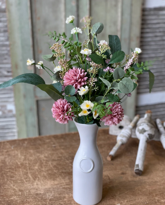 Floral Flare Bush | 21" A pretty burst of spring colors and blooms!  A diverse bouquet of showy pink pom pom mums, daisies, seed heads, tiny bubble berries, all nestled...