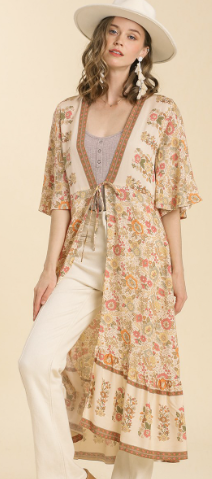 Floral Print Front Tie Long Kimono