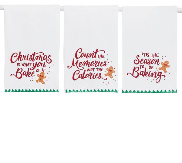 White tea towel with green decorative stitching and printed gingerbread artwork. Each towel has a red embroidered message: Tis the Season to be Baking, Count the Memories not the Calories,...