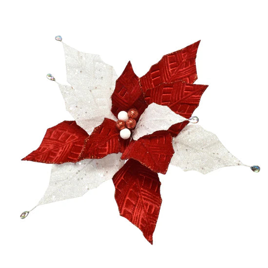 Glitter/Patterned Velvet Poinsettia w/ Jeweled Tips