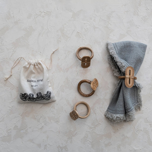 Handmade Bamboo Napkin Rings, Natural, Set of 4 in Printed Drawstring Bag