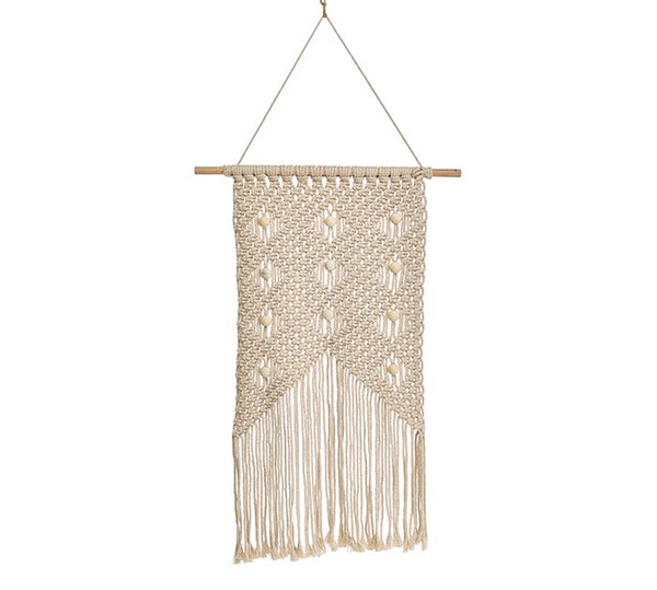 Cotton macrame wall hanging in natural color accented with wood beads hanging from wood dowel rod and has loop for hanging. 31" H x 18" W x 1" D. 44" H with...