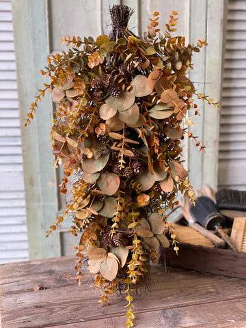 Warm and subtle fall tones. Luscious mixture of cinerea and silver dollar eucalyptus varieties speckled with miniature natural pine cones.