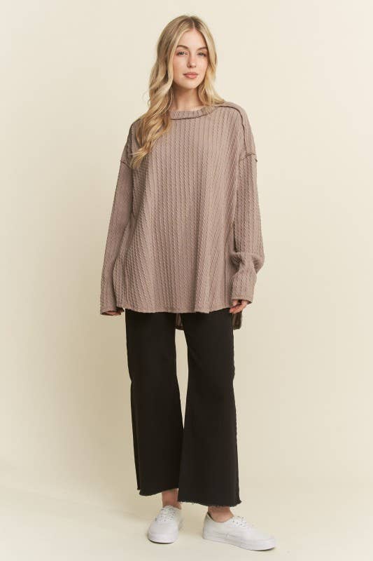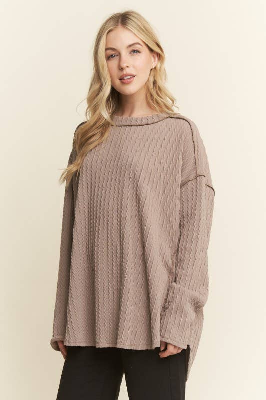 95% POLYESTER 5% SPANDEX LONG SLEEVE ROUND NECK SOLID JACQUARD URBAN TEXTURED TOP MODEL SIZE: HEIGHT 5'6", BUST 32", WAIST 24", HIPS 32"