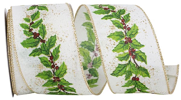 Width:2-1/2 inchPut-Up:10 YARDS Elevate your holiday creations with this ivory muslin ribbon adorned with a glittered holly design at its center. This gold wired edge ribbon is an excellent choice...