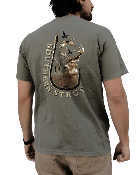 We can't miss! Year round outdoorsmanship is open for everyone. Here you'll have a hook, holding a nice matured buck with ducks flying over him.  Printed on an 100% Cotton...