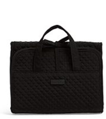 Microfiber is lightweight, solid-colored polyester. Three zip pockets. One large gusseted zip pouch. Tie and zip closures. Dimensions 8.75" w x 22.50" h x 1.25" d with 4.00" handle drop