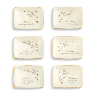 "Daughter, a wish come true;" "Wishes for peace, love & joy;" "Grandma, a generous treasure;" "Mom, a loving protector;" "Sister, a friend for life;" and "Friend, a bright light in...
