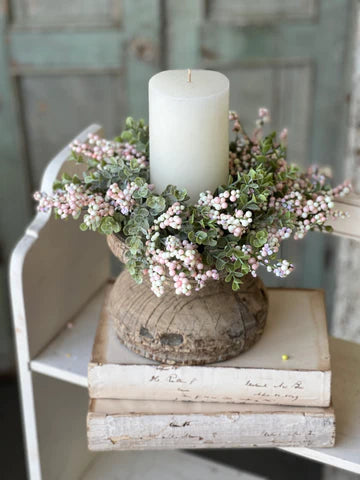 Lightly powdered eucalyptus greenery is laced with branching sprigs of colorful bubble berry clusters and small petals to create this lively collection. materials: plastic, polyester, styrofoam bubble berries, plastic base 10" | 3"...