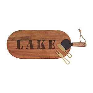 3-piece set. Etched mango wood paddle board with metal plate detail. Comes with brass finished metal cheese utensils.