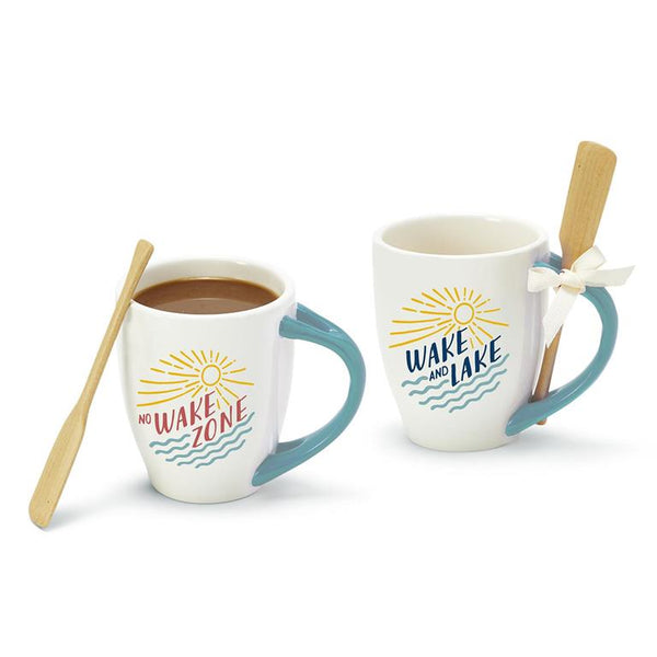 Lake Life Mug with Oar Stirrer Assorted 2 Designs: Wake and Lake and No Wake Zone (mug dishwasher/microwave safe, stirrer hand wash only) - Ceramic/Wood