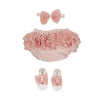 This pink lace diaper cover features adorable ruffles across the bottom and coordinating ribbon sandals and headband. Size 0-6 months
