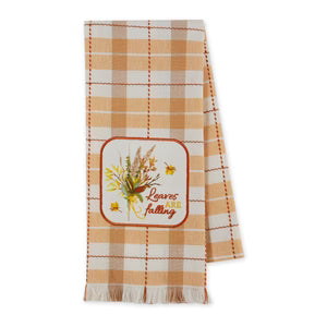 Dishtowel is embellished with "Leaves Are Falling" embroidered applique patch and hem is finished with 3/4-inch fringe