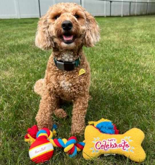 3-piece fun dog toy gift set 3" squeaky latex ball for fetch play 15" braided rope toy for tug play 7" baby-soft plush bone squeaky toy for sensory play Paw-fect...
