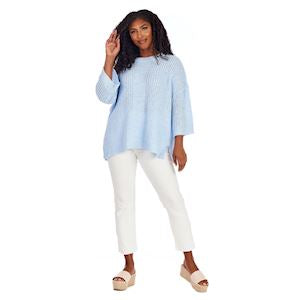 Ribboned knit sweater features custom knit pattern, three-quarter length sleeves and side slits at hem. One size fits most. Measures approximately 26" from shoulder to hem.