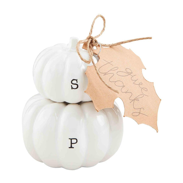 2-piece set. Ceramic salt and pepper pumpkin shakers stack and secure together with magnets.