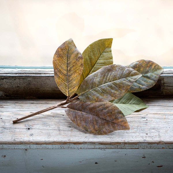 Hand wrapped construction and printed fabric leaves give this magnolia pick a life-like quality.  15" Polyester, Plastic, and Wire