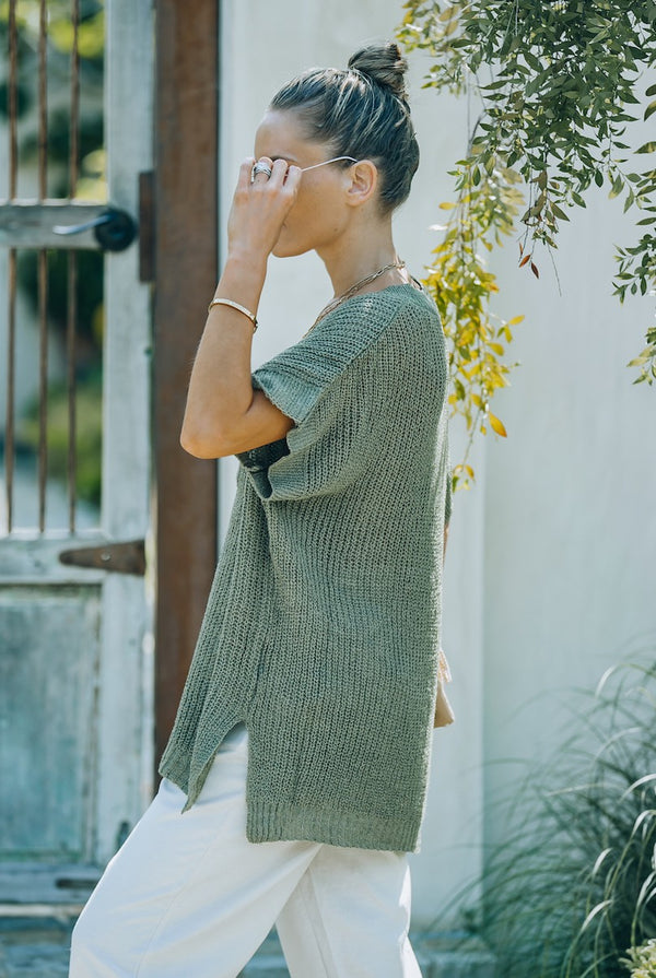 - V-NECK LINE - DOLMAN SHORT SLEEVE - LIGHTWEIGHT SWEATER - SLIT DETAIL ON SIDE