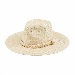 Paper straw fedora with braided straw accent band features adjustable interior strap.