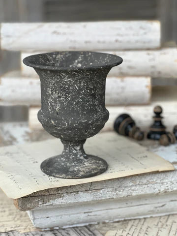 A charming urn in a perfectly petite size to fit most anywhere!  Adds a rustic touch to displays.  **Distressed French Gray Finish** materials: metal  Other decorations sold separate