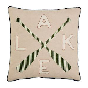 Appliqued cotton pillow with piped trim. Zipper closure.