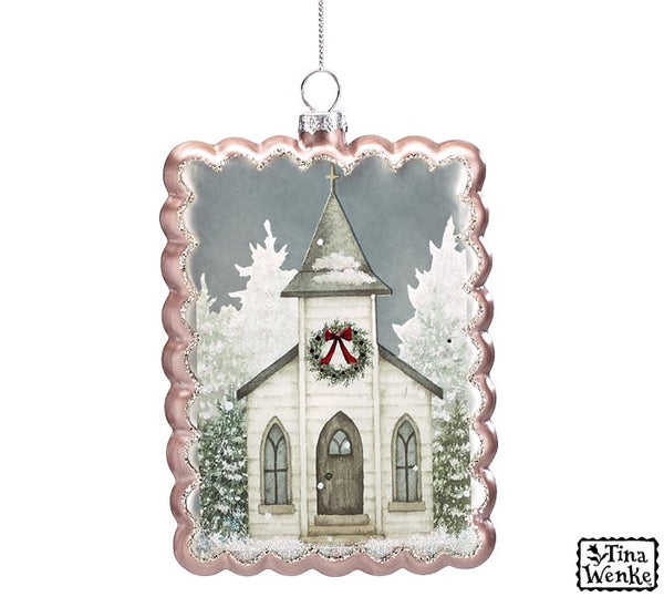 Rectangle shaped ornament with a snowy church church scene image. The church is white and has a wreath on the front surrounded by a snowy tree background. The edges of...