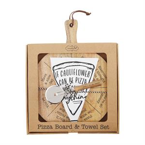 3-piece set. Wooden pizza paddle board. Comes with wood and metal pizza cutter and flour sack towel