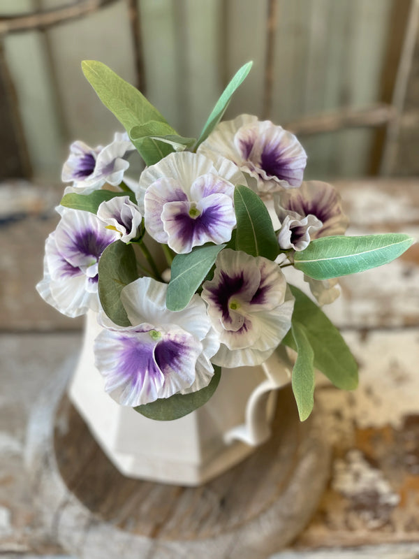 A true harbinger of spring! Beautifully colored real-touch pansies form a cheerful bundle with light toned foliage. Each bundle contains 7 stems bound with a raffia tie. Other decorations sold...