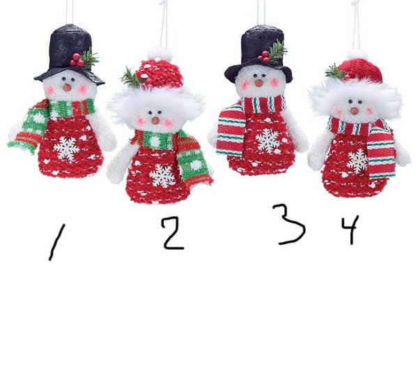 Plush snowmen ornaments in display box. Snowmen have red polka dot bodies. Two snowmen have black top hats and two snowmen have a red hat with fur trim. All have...